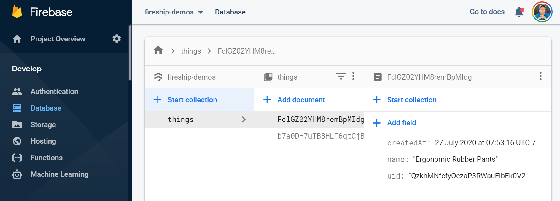In this example we have a things collection. Our goal is to create a relationship between the currently signed-in user and Firestore where a user can have many things, while each thing belongs to one user. One way to model relationship is to save the user’s uid value on each document like so: